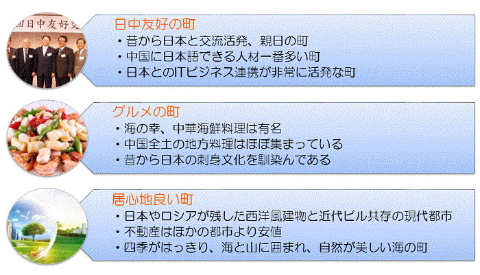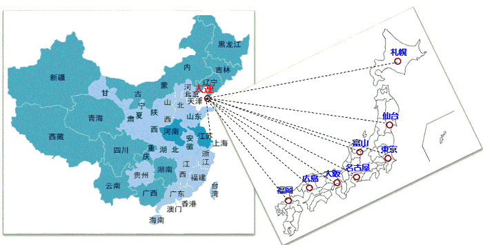 大連市は中国東北の遼東半島の最南端にある日本の文化を馴染んである海の町、飛行機で福岡まで1時間、東京まで2時間半の日本と近い位置にある。